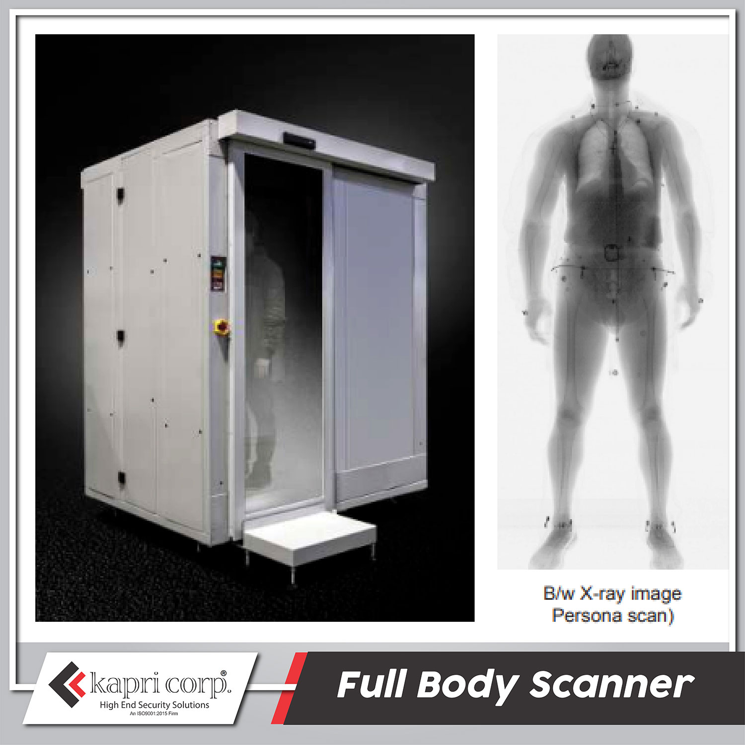 The Full Body Scanner supplied by Kapri Corp is a non-intrusive personnel screening system designed to assist security agencies in detecting concealed items on individuals at controlled entry points.